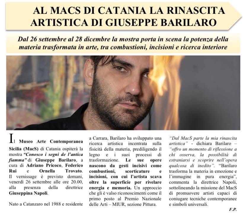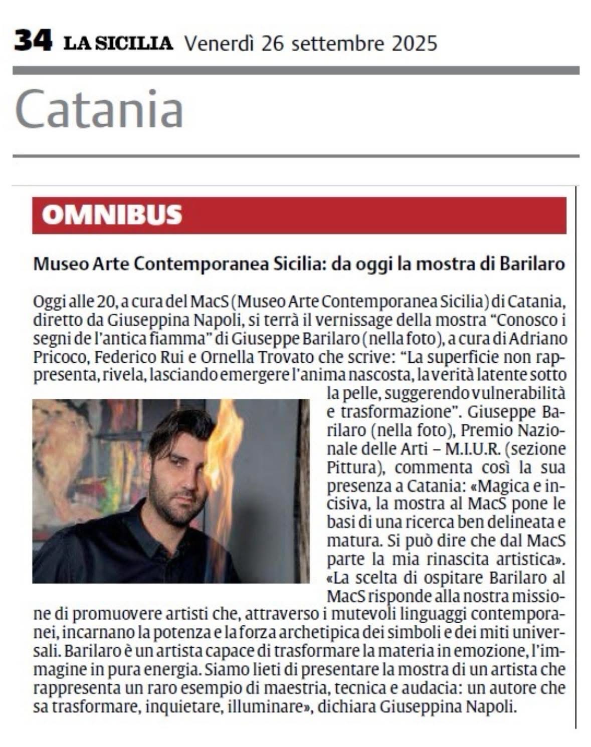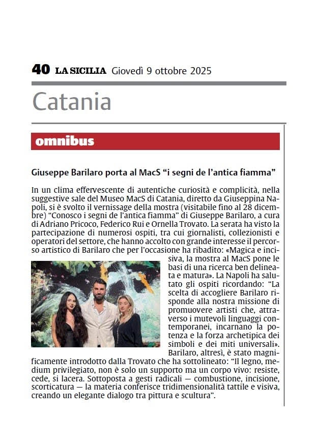 VERNISSAGE CONOSCO I SEGNI DE L'ANTICA FIAMMA — Giuseppe Barilaro Curated by: Adriano Pricoco — Senior Curator Federico Rui — Senior Curator Ornella Trovato — Junior Curator Starting September 26, 2025, MacS museum will host Conosco i segni de l’antica fiamma, a solo exhibition by artist Giuseppe Barilaro. The exhibition will be open to the public until December 28, 2025, during regular museum hours, with a single ticket also granting access to the permanent collection. COMUNICATO STAMPA POST VERNISSAGE: Successo al MacS per il vernissage della mostra “Conosco i segni de l’antica fiamma” di Giuseppe Barilaro CATANIA – In un clima effervescente di autentiche curiosità e complicità, nella suggestive sale del Museo MacS (Museo Arte Contemporanea Sicilia) di Catania, diretto da Giuseppina Napoli, si è svolto il vernissage della mostra personale “Conosco i segni de l’antica fiamma” di Giuseppe Barilaro, a cura di Adriano Pricoco, Federico Rui e Ornella Trovato. La serata ha visto la partecipazione di numerosi ospiti, tra cui giornalisti, collezionisti e operatori del settore, che hanno accolto con grande interesse il percorso artistico di Giuseppe Barilaro (Premio Nazionale delle Arti – M.I.U.R., sezione Pittura) che per l’occasione ha ribadito: «Magica e incisiva, la mostra al MacS pone le basi di una ricerca ben delineata e matura. Si può dire che dal MacS parte la mia rinascita artistica. Offro un momento di riflessione, chi guarda un quadro si dedica del tempo, dedica un minuto, un piccolo istante alla riflessione e per una volta, forse, nella vita, decide di estraniarsi dal mondo esterno. La mia poetica consiste nel trovare all’interno della materia un qualcosa di nuovo ogni volta. Io lacero e distruggo, non posso delineare un pensiero o un modo di lavorare, nelle imperfezioni del mio gesto scopro sempre il fascino di qualcosa che non conosco». Salutando i numerosi intervenuti, Giuseppina Napoli (Direttrice Museo MacS), ha ricordato: “La scelta di ospitare Giuseppe Barilaro al MacS risponde alla nostra missione di promuovere artisti che, attraverso i mutevoli linguaggi contemporanei, incarnano la potenza e la forza archetipica dei simboli e dei miti universali. Giuseppe Barilaro è un artista capace di trasformare la materia in emozione, l’immagine in pura energia. Il MacS è lieto di presentare la mostra (visitabile fino al prossimo 28 dicembre 2025) di un artista che rappresenta un raro esempio di maestria, tecnica e audacia: un autore che sa trasformare, inquietare, illuminare». Giuseppe Barilaro, altresì, è stato magnificamente introdotto dalla Curatrice Junior, Ornella Trovato, che ha sottolineato: “Il legno, medium privilegiato, non è solo un supporto ma un corpo vivo: resiste, cede, si lacera. Sottoposta a gesti radicali — combustione, incisione, scorticatura — la materia conferisce tridimensionalità tattile e visiva, creando un elegante dialogo tra pittura e scultura. La superficie non rappresenta, rivela, lasciando emergere l’anima nascosta, la verità latente sotto la pelle, suggerendo vulnerabilità e trasformazione. L’arte di Barilaro è brutale, è gesto e poesia. Un gesto che non concede indulgenze ma si espone nella sua nudità feroce. È l’arte stessa a guidarlo, ardendo dalla necessità di essere plasmata”. Alle domande nei numerosi intervenuti Barilaro, sul controverso e sempre attuale concetto di “arte”, ha risposto: «Non credo che l’arte abbia mai contribuito a qualcosa, chiedo scusa per il mio cinismo, forse gli è stato attribuito un significato importante nel corso del tempo, l’hanno ingigantita abbastanza, tanto da non reggere più il peso del caos incessante di questo strano mondo. L’arte la fa l’uomo, per quanto mi riguarda è un resistere al tempo, decidere di voler dire qualcosa di importante e cercare, per quel che serve, di evidenziare alcuni aspetti della società. L’artista non è responsabile, documenta la vita». In conclusione, significative le parole del Curatore Senior, Federico Rui: «Nello studio di Barilaro, ogni pennellata è un segno di quel fuoco, antico ma mai del tutto spento, che arde ancora sotto la superficie. Nella pittura contemporanea, soprattutto in quella che tenta di ricucire il legame con la figurazione e con il gesto espressivo, emergono a tratti i segnali di una passione antica. L’artista, nel suo confronto silenzioso con la tela, rivela spesso un trasporto che va oltre il progetto tecnico o la ricerca concettuale. È in questo contesto che la citazione dantesca (il titolo della mostra) assume un valore quasi archeologico: una traccia viva di un sentimento originario per l’immagine, per la materia pittorica intesa non come campo di sperimentazione, ma anche luogo di ritorno». COMUNICATO STAMPA: Il Museo MacS di Catania presenta Conosco i segni de l’antica fiamma di Giuseppe Barilaro “Un ritorno radicale alla fisicità della pittura, dove il calore diventa linguaggio e la superficie si fa forma” dal 26 Settembre, ore 20.00, Vernissage, al 28 dicembre 2025 Venerdì 26 settembre, alle ore 20.00, a cura del MacS (Museo Arte Contemporanea Sicilia) di Catania, diretto da Giuseppina Napoli, si terrà il vernissage della mostra “Conosco i segni de l’antica fiamma” di Giuseppe Barilaro, a cura di Adriano Pricoco, Federico Rui e Ornella Trovato. Giuseppe Barilaro (Catanzaro il 16 luglio 1988 - vive e lavora a Carrara), predilige la manipolazione di materiali “vergini”, al contempo resistenti e duttili, per tracciare sulla materia stessa il percorso della vita; ed è con il legno che, influenzato da queste caratteristiche, ha instaurato un’impronta ancora oggi presente. Nelle sue opere, sarebbe riduttivo trattare lo studio delle forme senza considerare la loro correlazione con la “sostanza”, vera protagonista del lavoro stesso. Gli interventi che l’artista realizza sul corpo del supporto includono: la combustione del legno, la scorticatura e