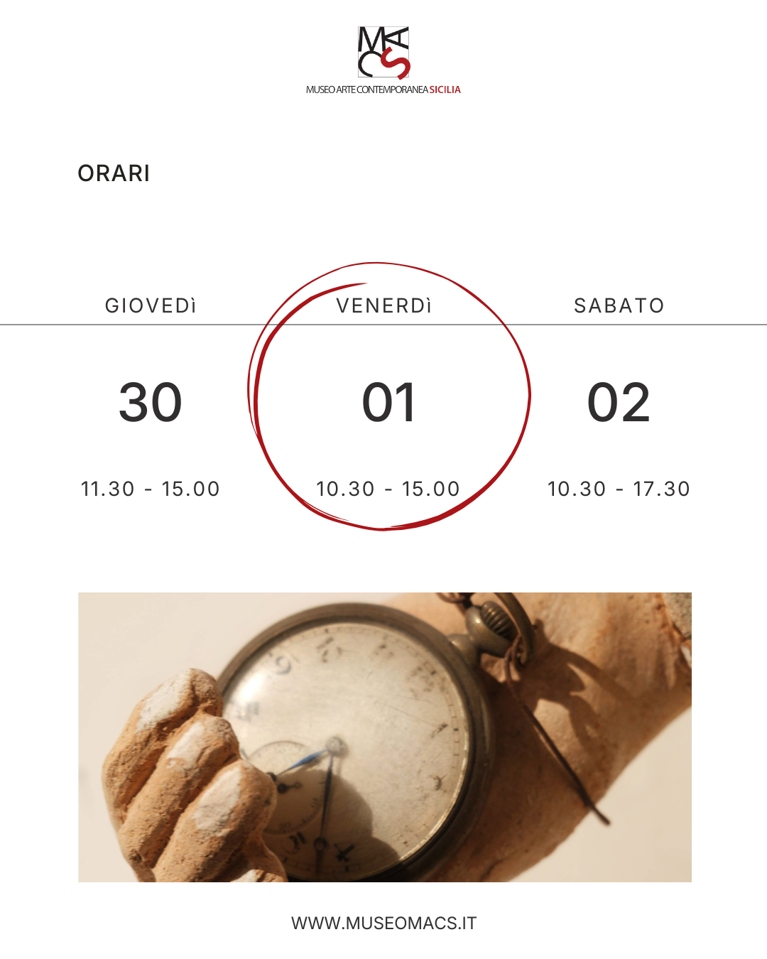 Avviso ai Visitatori: Si comunica ai gentili visitatori che il Museo MacS resterà aperto venerdì 01 maggio dalle ore 10.30 alle ore 15.00. 📩 segreteria@museomacs.it • www.museomacs.it |